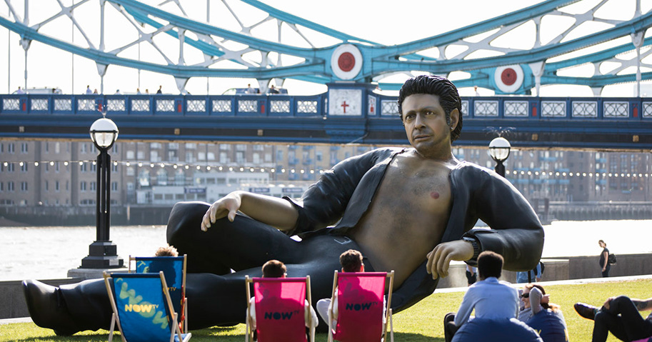 Mere days after London let fly their Trump Baby Balloon in protest of the Donald's visit to the Queen of England, a new 25-foot-tall statue of JURASSIC PARK star and human meme, Jeff Goldblum, has been erected in Potters Field, in front of London’s Tower Bridge. Serving as a way to commemorate the 25th anniversary of JURASSIC PARK, the dashing monument to Goldblum's Dr. Ian Malcolm – that was commissioned by the NowTV streaming service – weighs 330 pounds. Fun Fact: A recent study has found that the weight of Goldblum's sexiness is incalculable.