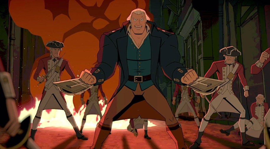 From there, the movie aims to bring elements of contemporary filmmakers like John Woo and franchises like The Fast Saga and the Marvel Cinematic Universe into a two-dimensional animated world. But, as the film moves from scene to scene, rarely any of which make a lick of sense, we find Washington assembling his Avengers-esque squad of heroes including beer bro Sam Adams (Jason Mantzoukas), mentally stunted horseman Paul Revere (Bobby Moynihan) and Chinese female inventor Thomas Edison (Olivia Munn). John Henry (Killer Mike) and Geronimo (Raoul Trujillo) also join in the fight against the tyrannical King George (Simon Pegg).