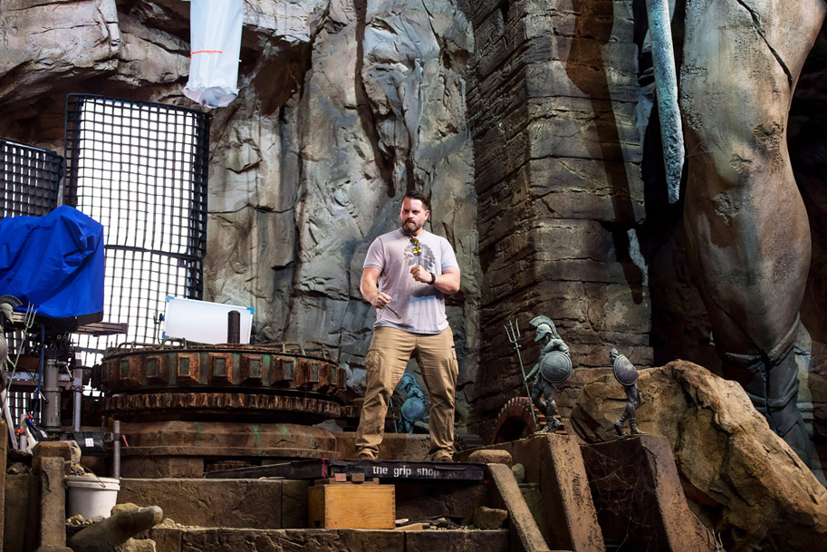 Peter: It’s a good question. I’ve worked with him on two other films with him directing and then three other films with him as a fellow producer and his camerawork is his signature. He really gets off on creating interesting shots that tell the story in a really cool way. So, as he’s developed the storyboards and the early conversations with Don Burgess, our DP, who also did The Conjuring 2, it’s always been about finding interesting ways to tell the story. And, y’know, one of the things that I always love that James does is he ties pieces of action, disparate pieces of action, together in one shot, so as you finish this piece of action with Mera, in the background youre picking up Arthur doing his thing and you fall right into the storyline, so there’s some really cool examples of that. But, every-just the storytelling in general with this movie is complex from a camera perspective, because so much of it is set underwater. And so you have actors on tuning forks-and I don’t know if you’ve seen these on other set visits, but there are-and we’ve adapted them to make them work even better than they’ve ever worked before-but the actors are on long-they look like giant tuning forks with a little pick at the front that go on the hips and it allows them to have the appearance of buoyancy. It also gives them rotational abilities and you have guys maneuvering the tuning forks so you can push them forward, but there’s a big steering wheel on the end so you can also turn them so that it looks like they’re spinning or floating, whatever it is. So, James has created a language and a methodology with Don Burgess, with R.A. Rondell, our stunt coordinator, with Kyle [Gardiner], our other stunt coordinator, they have together figured out a methodology to tell the story in a really interesting and effective manner and it’s kind of a beautiful thing to see. And that’s part of what you couldn’t have done several years ago, like the technology just wasn’t there between visual effects, camerawork, the special-effects nature of building these tools and it all comes together in a really interesting manner.