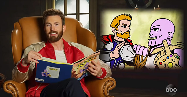 Involved in the fireside reading are Mark Ruffalo, Jeremy Renner, Scarlett Johannson, Chris Evans, Chris Hemsworth and Don Cheadle, all of whom take turns reading certain bits of the story and pausing every now and again to lend some commentary. Showing off the cute pictures in the background, Thanos looks like a sweet little, purple bald man with colorful gems, but the majority of the cast make note that his chin still looks like a giant, in the words of Star-Lord (Chris Pratt), “nutsack.”