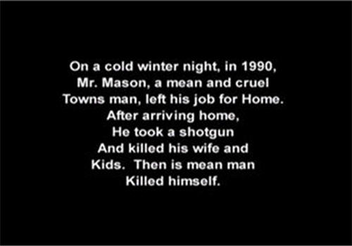 With VHS camcorder picture quality and a ratio that switches from full to widescreen without warning, AX ‘EM is a veritable feast for the eyes. You’ll enjoy visuals too blurry and out of focus to comprehend, or nighttime cinematography so poorly lit your TV will look like a completely black screen. The sound isn’t much better, as the filmmakers clearly didn’t know how to properly position a microphone to record sound. So dialogue is either painfully loud or too soft to hear. Not that it really matters though, since I doubt there was even a script for this movie. The majority of the dialogue is just people talking or screaming over each other. And what little was written ahead of time is pure gibberish. Just look at the grammatical and spelling errors in this opening title card: