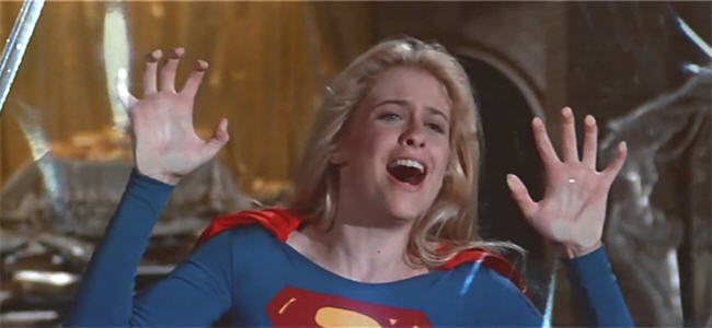 It's almost possible to overlook all of SUPERGIRL's most glaring faults just on the basis of how genuine and great Helen Slater is as the title character. The actress totally gets the sense of wonder and fun the character needs, but is unfortunately trapped in the bad movie built around her. (Seriously, she's so good, she can almost pull off the line, "What's a dingleberry?") So much of Supergirl's story makes little sense. On the way to Earth, Kara's pod somehow gives her the same perfectly-tailored outfit as her cousin, and also imbues her with the power to change her clothes and hair color at will. Once she reaches our planet (emerging from a lake via an actual cardboard cutout), Kara gets no real introduction to Earth. She immediately discovers her superpowers and, instead of looking for the Omegahedron to save her species from dying again, makes the bizarre decision to…enroll in college (?!). Despite being confused as to what a tree is, Kara somehow understands how to use a typewriter to forge a proper letter of recommendation to trick the dean of admissions. Once accepted, she also happens to become roommates with Lois Lane's sister Lucy, is placed in a math class taught by a warlock, and sort of accidentally stumbles on to the film's villain.