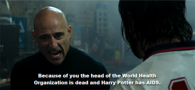 There's a surprisingly decent supporting cast that joins Cohen, including Ian McShane, Isla Fisher and Penelope Cruz, but everyone is completely wasted, spending their entire screentime looking at monitors or talking on the phone. And then there's Mark Strong—poor Mark Strong—who's subjected to the absolute worst, most embarrassing stuff in GRIMSBY as Cohen's super spy brother. I have no idea what the respected British actor was thinking when he agreed to do this movie. I imagine Strong reading the script and getting to his line, "You can suck my scrotum or you can let me die. SUCK MY BALLS!" and calling his agent and saying "Yes, sign me up!" Or calling the authorities and agreeing to do the movie in exchange for Cohen releasing his family unharmed.