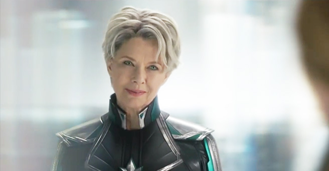 The upcoming superhero movie CAPTAIN MARVEL stars an impressive cast including Brie Larson, Jude Law, Samuel L. Jackson, Gemma Chan, Djimon Hounsou, Ben Mendelsohn and more. Among the ranks is Oscar-nominee Annette Bening, who until recently has had her role kept hidden from reveal. Now thanks to a new clip we’ve learned that Bening will be playing Supreme Intelligence, a highly-sophisticated form of artificial intelligence and ruler of the Kree, and in the clip, she breaks down the biggest threat to the galaxy to our title hero.