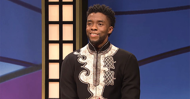 T’Challa/Black Panther (Chadwick Boseman) not only has ruling Wakanda to worry about, but he’s going to be leading the charge into battle against Thanos in the upcoming AVENGERS: INFINITY WAR. However, every king deserves to have some fun now and again, and Boseman got a chance to bring back the king for a round of Black Jeopardy on SNL. He may be capable of saving the day on numerous occasions, but he can’t help but hilariously fail when trying to answer some problems from categories like “Grown Ass,” “Aw Hell Naw,” and “White People.”