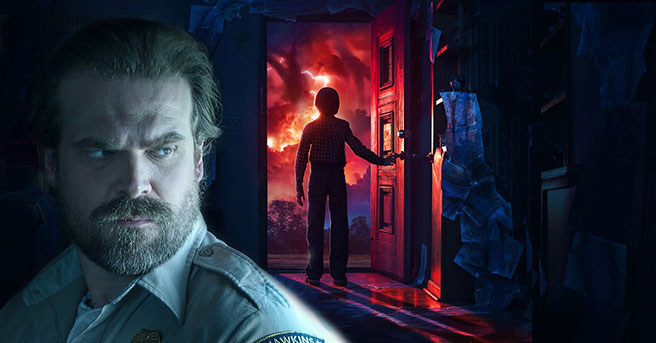 The third season of STRANGER THINGS might not be making its Netflix debut until 2019, but that's not going to stop the press from asking David Harbour for information about what we can expect from the show's forthocming installment. Ever since the close of STRANGER THINGS Season 2, Harbour has been hard at work while contributing to the making of Neil Marshall's HELLBOY reboot in which David stars as "Big Red" himself. I'll bet you anything that, while going through his daily and detailed makeup process for the Hellboy role, Harbour has been afforded plenty of time to think about his STRANGER THINGS character, Jim Hopper.