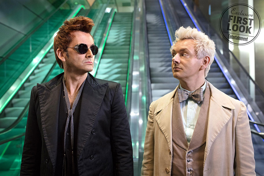 Today, Entertainment Weekly treated fans to a par of new photos from the upcoming television series, which give us our best looks yet at a few of the fantasy drama's key players. In the first image, we find Sheen's innocent-looking Airaphale and Tennant's devilishly-clever Crowley exiting a flight of steps, no doubt on their way to make mischief for mortals.