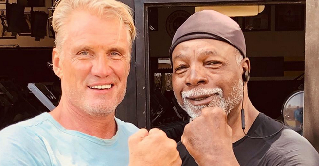 In real-life however, there's nothing stopping Dolph Lundgren and Carl Weathers from a friendly little rematch, and the pair recently caught up at Gold's Gym in Venice, California where they snapped a pic together.
