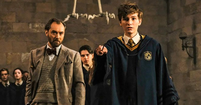 We knew that Newt Scamander (Eddie Redmayne) found himself under the instruction of Albus Dumbledore (Jude Law) while attending Hogwarts School and Witchcraft and Wizardry, but it seems that we'll actually be flashing back to Newt's time at Hogwarts in the upcoming FANTASTIC BEASTS: THE CRIMES OF GRINDELWALD. A new image has been revealed by Entertainment Weekly which finds Dumbledore schooling young Newt (Joshua Shea), who is looking rather alarmed as he points his wand towards…something.
