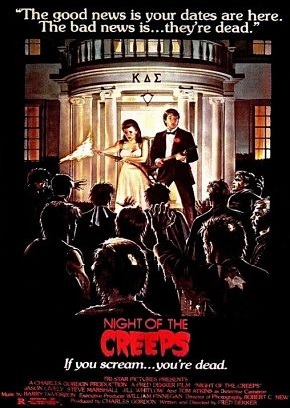 NIGHT OF THE CREEPS unexpectedly begins with a chase sequence on a space ship that involves odd little aliens who have horrible aim. Brief action and horror beats throughout the running time then build up to a zombie assault on a sorority house where the walking slug factories are taken out with gunfire and flames. The climactic battle seems a bit quaint and slow when viewed thirty years later, but the characters get the job done, and in one very cool moment a lawnmower is put to unconventional use. Peter Jackson took this idea and cranked it up to 11 (and beyond) for DEAD-ALIVE.