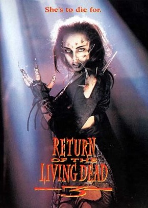 RETURN OF THE LIVING DEAD III is carried by the character of Julie, a wild girl turned on by danger in life who becomes an extremely endearing character in death; understandably disturbed by the knowledge that she is one of the living dead and struggling as hard as she can against the intense hunger she is beginning to feel. When she discovers that pain briefly distracts her from the symptoms of being dead, she goes a little overboard, and ends up turning herself into what I believe is one of the great horror icons of the ’90s. The image of Julie with slashes on her body and various metal objects and shards of glass stuck through her skin is an incredible visual that I’m left wishing we could have seen a lot more of, but as it is this memorable look is featured in a great sequence.