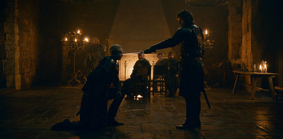 The moment is poignant and beautifully played out by Gwendoline Christie and Nikolaj Coster-Waldau, as the two let the moment linger and as the camera captures their soulful performances and the tenderness of the scene. With each tap of the sword on her shoulders, the emotional weight gets heavier and heavier, and when she rises, the small gathering around her cheers her name.