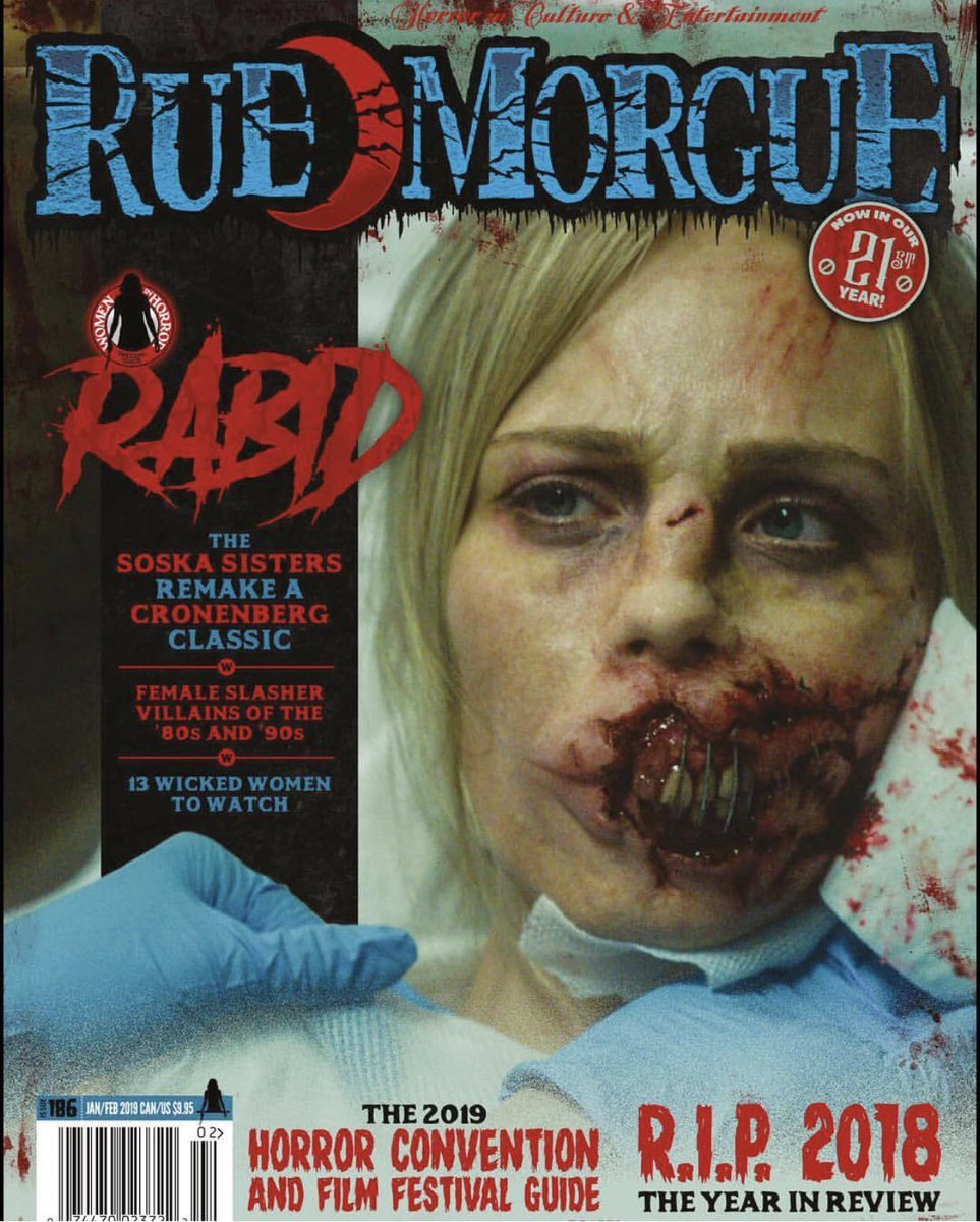 The Soska Sisters' remake of David Cronenberg's RABID starring Laura Vandervoort is one of the upcoming horror movies that I'm looking forward to checking out the most. I dig the sisters' flicks and I love me some Body Horror. And today we have a new look at the film – via the cover of Rue Morgue magazine – which should do more than enough to let us all know that the film will be suitably disgusting. Hoo-ray!