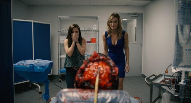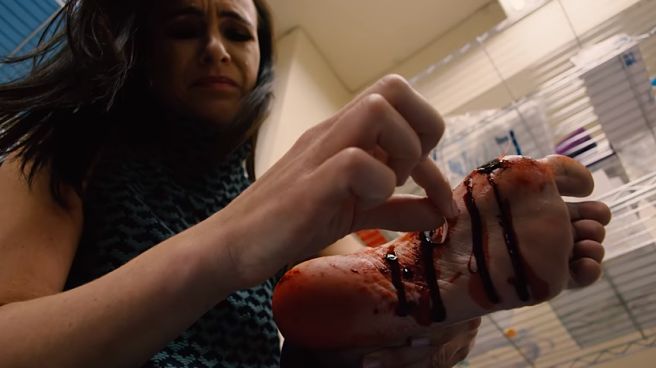 The doctors in this time-loop hospital seem to be torturing the helpless patients, with highlights being a surgeon taking a cheese grater to a burn victim's leg and a team of nurses performing an emergency birthing on a patient… who isn't pregnant. Yeah, it's weird. And bloody. And speaking of bloody, the film’s highlight (other than Danielle Harris) is the absolutely stunning and disgusting makeup effects via Robert Kurtzman's Creature Corps. The company has been around the gory block more than a few times and it shows in spades. We get exposed brains, ripped-out guts, and blood and gore by the buckets. This film is red as hell and happy to linger on the effects, which hold up to the bright hospital lights in long takes, no problem. Good f*cking job, David Henson Greathouse, Barry Aslinger, and Beki Ingram!