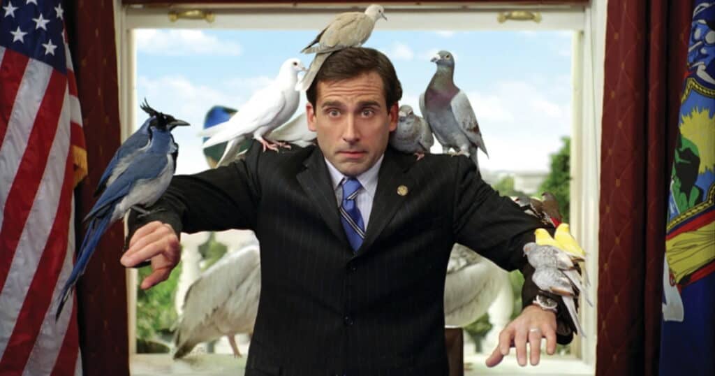 I think it might have been, it was early on. It might have been those birds on me. They were on me for a few days straight. And they were real. That wasn’t a computer-generated flock of birds on me. So, I think the fact that they would literally not get off of me and I could move around and I don’t know how they trained them to do it, but they would go nowhere. And frankly, and to be blunt, they were all well fed before shooting began. So, that posed it’s own set of difficulties as well.