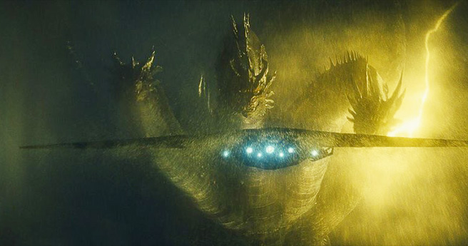 Based on the trailers for the upcoming GODZILLA: KING OF THE MONSTERS, it appears everyone’s favorite giant, city-leveling lizard will have to earn his mighty crown by defeating several other massive creatures in an epic showdown. The ultimate rival for him is the three-headed dragon that looks straight from hell itself, King Ghidorah, a creature that looks more imposing than the Devil himself in a new image that finds him monstrously looming behind an aircraft.