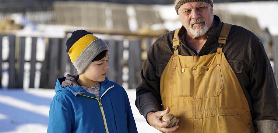 So we're left to wait and wonder, what secrets is Jacob hiding? KNUCKLEBALL is one of those films where you know something is going to go terribly wrong, you've been tipped off by the fact that it's categorized as a thriller, but it's just not clear what's going to go wrong or how. Peterson takes some time before answering any questions, and this thriller takes some time before it starts to get thrilling. Until then, Henry and Jacob bond while doing some work around the snowy farmland, and Jacob helps his baseball enthusiast grandson practice his pitching skills.