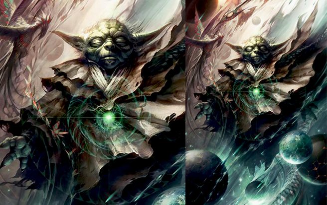 Masterful fantasy artist Raymond Swanland’s piece “One With The Light” captures the iconic Jedi Master Yoda in a tremendous blend of light, color, and movement that makes you feel as if you are witnessing the famed Star Wars character in the midst of a truly “Force-level” moment. A wonderful, lively piece.