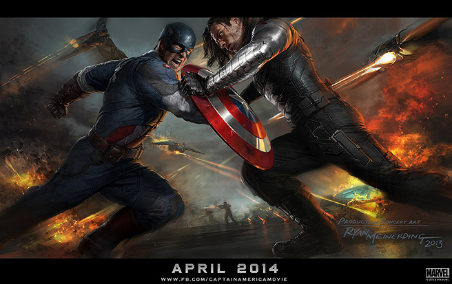 Released just prior to the start of Comic Con, this concept art image for CAPTAIN AMERICA: THE WINTER SOLDIER by Ryan Ryan Meinerding is simply a stunning, kick ass image that captures the intensity and epic-scale action that many are hoping to see in the Phase Two film from Marvel. Meinerding has been doing concept art for Marvel Studios for years and this is one of his best pieces to date, which was made available as a limited edition print throughout the convention. Fingers crossed that the movie is as awesome as this poster.