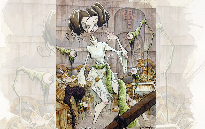 Artist Gris Grimly puts all eyes on Princess Leia in the famed Death Star trash compactor from STAR WARS with this piece called “All Eyes On You.” Available as a canvas print, this stylistic, quirky piece is one of the most fun I saw on the floor and has a great blend of subdued colors and gorgeous lines. It reminded me of a Princess Leia Aeon Flux right off the bat and I was sold. Terrific work.