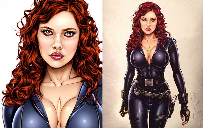 Armando Huerta is my favorite “cheesecake” artist working today and among the many pieces he had on display at Comic Con this year, the Scarlett Johansson Black Widow from IRON MAN 2 piece is one of my favorites. Heurta can range from sexy to raunchy, taking almost every well-known Hollywood beauty and putting her in an extremely risque position, if you catch my drift. From pencil drawings to paintings, Huerta makes already beautiful women pop off the page, sometimes right out of their clothes, and with his style being what it is, that makes me a happy panda.