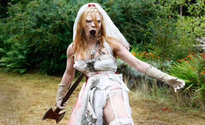 I must admit, DOGHOUSE is the one flick on here I’ve yet to see, but that hasn’t stopped me from noticing its sexy female zombie lead, played by stunner Victoria Hopkins. Quite the looker as you can see above (ha), with extra sex appeal derived from the purity of her chaste wedding gown. Of course, the gown grows just as dirty and bloody as she does when morphing into a flesh-starved walker. I know marriage takes years off your life, but good goddamn!