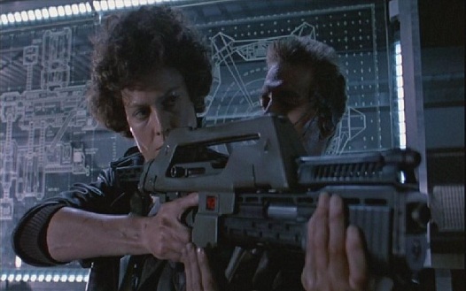 Whether Ellen Ripley or Dana Barrett, Sigourney Weaver has been subjected to her fair share of ultra-badass film weaponry over the years. Difference is, in Cameron’s ALIENS, she gets to grip that ever intimidating M41-A Pulse Rifle, evolving her status as bona fide action hero from the more demure, final girl of the first film. Here she’s for more assertive, far more in control. Of course, the bigger crew and more advanced arsenal helps out quite a bit. Still, when face to face with the breed of extraterrestrial monsters, she eviscerates the bulk of them to a gooey pulp…and so with the trusty Pulse Rifle. I know many consider ALIENS to be among the few examples of a sequel that surpasses its original. Unfortunately, I’m not in that camp. I find the campy, MTV-style action and humor of ALIENS to be far LESS frightening than the approach Scott took. I enjoy ALIENS a great deal, don’t get me wrong, but as an action flick, not a Gothic horror tale set in space.