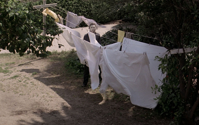 After Laurie Strode has made her fairly unsettling walk home (I love this whole sequence, from spotting The Shape disappearing behind the bushes to bumping into Sheriff Brackett for “one good scare”), she heads to her room and, for what can only be 2-3 seconds, sees The Shape standing in the yard amongst a bevy of swaying sheets. The strangest thing is, she doesn’t even look away before he has disappeared, seemingly into thin air. It’s a blink-and-you-miss-it moment, which makes it all the more chilling. And, we’ll learn before long, disappearing without a trace is one of Michael Myers’ special talents. – Eric Walkuski