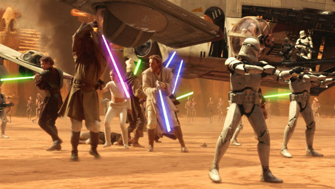 Think about this: the only Jedi featured in the original trilogy were Obi-wan and Yoda. Neither truly showcased their talents as warrior knights. The prequels delivered on the dreams of STAR WARS fans by showcasing dozens of Jedi wielding lightsabers and fighting to defend the Republic. The ATTACK OF THE CLONES closing battle on Geonosis gives us every Jedi dueling with the Trade Federation’s droid army and the results are awesome. This scene sets the tone for the CLONE WARS animated series and helped visualize an era from the saga thought about since Ben Kenobi mentioned the war in A NEW HOPE.