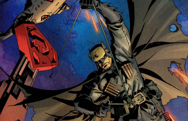 In this alternate history comic that finds Clark Kent arriving as an infant in Soviet Russia brought a very different version of Batman as well. Lex Luthor recruits Bruce Wayne whose parents were killed as a result of Superman’s actions. This Batman shares a visual look that makes him look more like a mercenary with a winter cap and more rugged uniform that shares some similarities with Captain America’s WWII design.