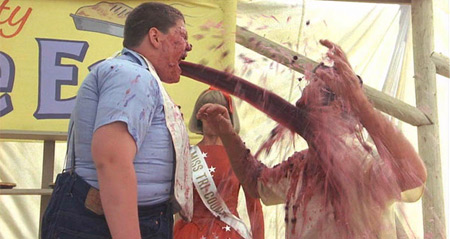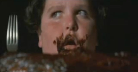 What better way to follow-up a scene with massive vomiting than with another scene of massive vomiting. In this sketch from Monty Python, the disgustingly obese Mr. Creosote (played by director Terry Jones), waddles into a fancy restaurant and before he can even order any food, orders a bucket to puke in. The barfing continues until the after-dinner mint arrives and then, well, I won’t spoil it for you. It would rank higher on the list but we never actually see the dude eating anything.