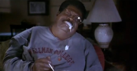 It was tempting to include the entire Klump family dinner here, especially with little Hercules, but there was something more excessive about a depressed Sherman Klump sitting by himself, late at night eating ice cream right out of the container and pouring M&Ms directly into his gaping maw.