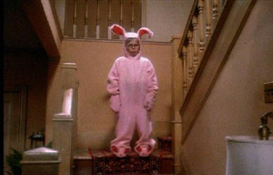 As if Ralphie’s (Peter Billingsley) life doesn’t suck enough, his aunt sends him a handmade pink bunny suit for Christmas and time stops in the Parker household until he puts in on for his mother. The things kids will do to get their hands on some firearms.