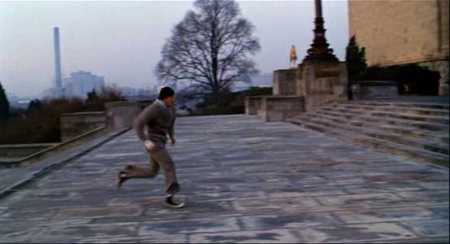 You know how all of Rocky’s workout montages show him conquering some sort of physical obstacle? I wish they would have done that here, with the stairs. The first couple tries he just totally wipes out on the first stair. The next effort has him make it half way and he falls backwards and rolls to the bottom. Maybe, at one point, he runs up the wrong set of stairs and ends up at the gates of Heaven. I’m telling you, it would make his celebration at the end that much better.