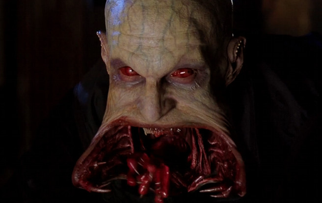 Well well, take a look at that radiant smile. Gorgeous! Given how del Toro has sort of become a brand name unto himself over the years, it’s easy to forget he was at the helm of a franchise he didn’t create. Alas, BLADE II is a more than competent sequel, in no small part thanks to the mortifying monsters he designed, realized and put square in the aim of Wes Snipes. The primary band of baddies, called Reapers, were a race of bald, alabaster-skinned, foul-mouthed, pointy-eared, artificially enhanced vampires whose immunity to garlic and silver and higher dependency on fresh blood proved a tough task for our hero Blade to jettison. Well, tougher. With a wide opening, triangular maw equipped with a large tube-like tongue for feeding, the Reapers are easily one of the nastiest and gnarliest creatures del Toro’s conjured!