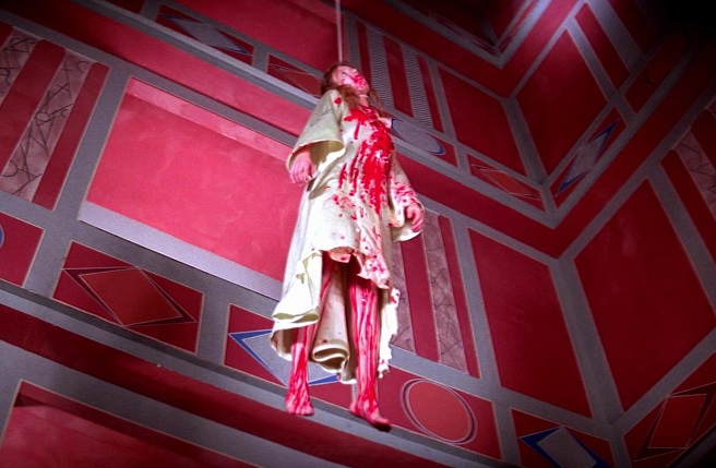ARGENTO!!! As far as homicidal hangings are concerned, none in the history of cinema have been both heart-startling horrific and visually gorgeous in the way the Italian splatter maestro composed the infamous death scene in SUSPIRIA. Shite’s perfection. The lighting, the colors, the framing, the stylized gore, the camera angle…it’s alchemical cruelty of the highest order. Even the aftermath shot of the girl’s lifeless legs swinging above a lovely puddle of her own goopy blood could be framed and hung in a museum!