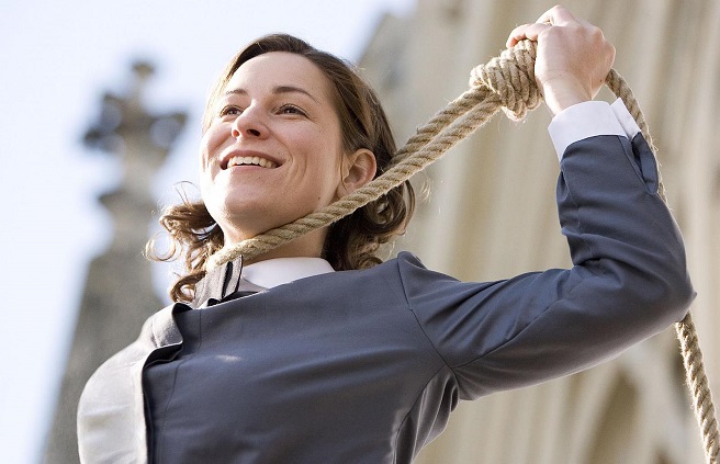 Just because it’s our most recent movie hanging doesn’t mean it’s any less unnerving than the rest. In fact, the opening sequence of SINISTER, in which we witness a ritualized family hanging of the eeriest degree, is one of the more indelible images of any horror joint to come out in recent years. Four dead bodies, relatively young, heads draped in burlap sacks so we cannot see their faces, swaying from a spooky elm in the front yard. Shite’s brutal! That the action springboards the entire narrative makes it all the more powerful.