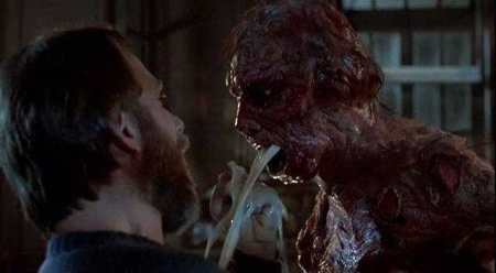 Here’s what makes Brundlefly the most evil bug – he’s half human. That brings an entire new set of rules to his sadistic tendencies and twisted agenda. Normal flies use that regurgitation trick above to liquefy food so they can eat, so they can survive. Brundlefly does it because he hates that dude’s beard and the fact that it rubs up on his woman. Lesson learned. Don’t grow a beard.
