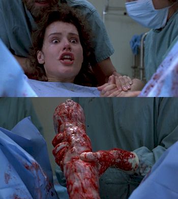 Reason number 6 why you should never get raped by an alien. Rules 1 through 5 all involve penis size. It’s bad enough watching a full grown man exit this woman’s vagina as she gets set to wash the dishes, he then has to chew through the cord and slosh his bloody gelatin all over her kitchen. A woman’s work is never done. Actually, hers is – she’s dead.