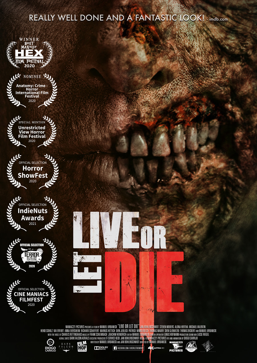 Meanwhile, LIVE OR LET DIE – directed by Manuel Urbaneck and starring Jan Bohlenschmidt, Manuel Urbaneck, Steven Mooers, Alona Hertha, Michael Valentin, Heiko Schulz, Markus Hettich, Dirk Jeblick, Kai Erfurt, Anna Eversheim, Richard Schaffert, Sven Glowatzki and Rosanna Schymanski – which premiered earlier this year at the UK's Horror on Sea Film Festival, will soon be available domestically later this year!