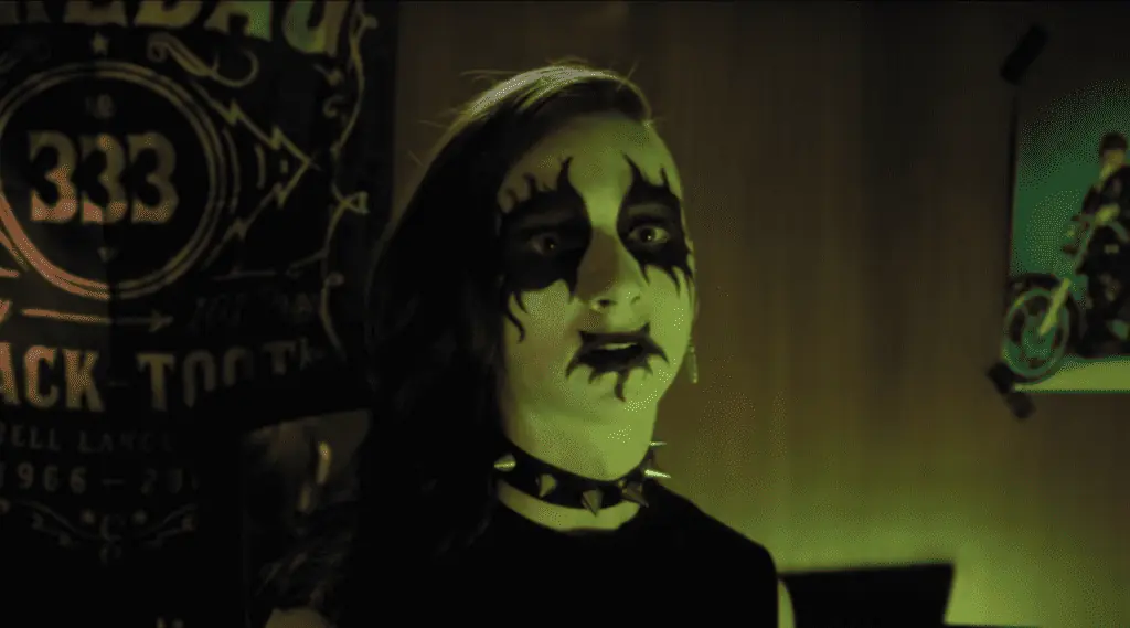 Metal Lords comes with some unexpected collaboration behind the scenes. Directed by Peter Solett, best known for Nick & Norah’s Infinite Playlist, Metal Lords is written by D.B. Weiss. Weiss, co-showrunner of Game of Thrones with David Benioff, instills what I can only assume is his own personal high school experience for this story centered on Kevin Schlieb (Jaeden Martell). A nerdy teen who is in marching band to avoid P.E., Kevin is befriended by Hunter Sylvester (Adrian Greensmith) to join his band, Skullfucker. Hunter’s mom left when he was in middle school so he lives with his plastic surgeon father (Brett Gelman). When the opportunity arises to compete in their school’s Battle of the Bands, Hunter and Kevin sign up while also searching for a bass player. Complications arise when Kevin befriends transfer student Emily Spector (Isis Hainsworth) who causes a rift between the friends.