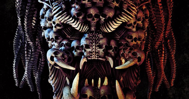 Director Shane Black and co-writer Fred Dekker's THE PREDATOR has unveiled a new image and poster at this year's San Diego Comic-Con. The new image shows a Predator piloting his ship (or something like that) but all that aside, the new poster is a work of stunning "graphic" art as it is comprised of the infamous Predator visage – made completely out of human skulls. It's as badass as it sounds.