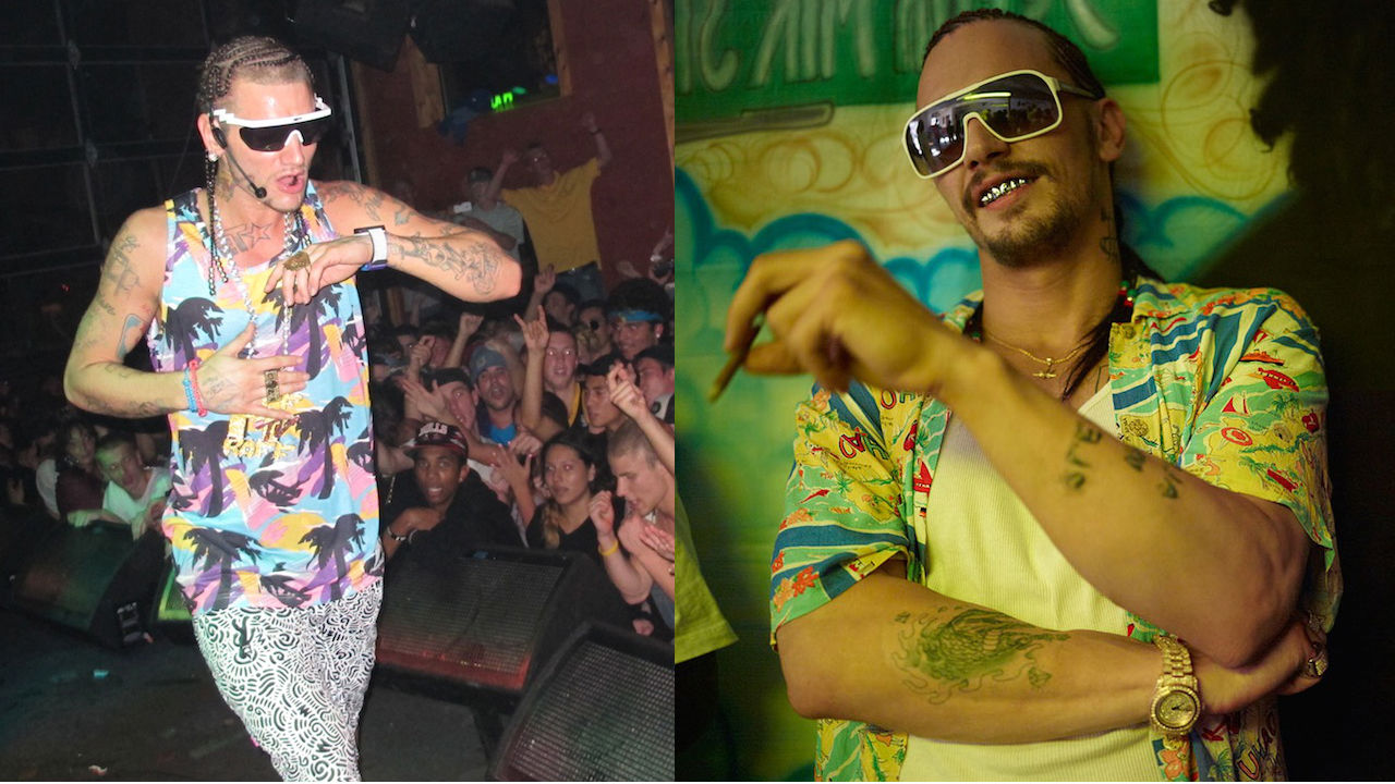 As the story unfolds, it's revealed that Cage did not get the part but he did recently request a meeting with Rogen where he asked him if he had told James Franco about his idea because he suspected Franco stole his pitch for what would become the character of Alien in Spring Breakers. Even though the character does fit the description of a "white Jamaican" or "white Bahamian", many believe that Franco actually got the inspiration for the role from the rapper Riff Raff. If you're familiar with his look and his demeanor, it seems more in line with what Franco was going for. Check out a side-by-side photo of James Franco as Alien and Riff Raff below to get a better idea of what most likely was the inspiration for the character.