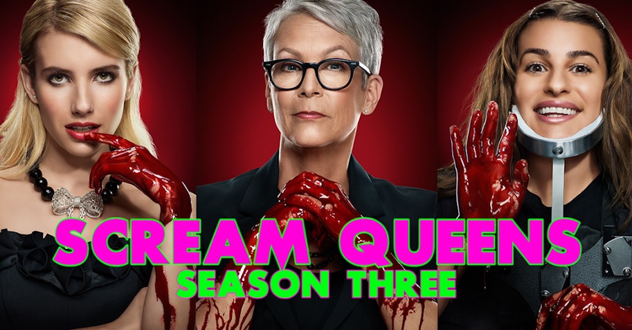 SCREAM QUEENS was written and created by Ryan Murphy, Brad Falchuk, and Ian Brennan and starred Emma Roberts, Skyler Samuels, Glen Powell, Diego Boneta, Abigail Breslin, Keke Palmer, Oliver Hudson, Nasim Pedrad, Billie Lourd, Niecy Nash, Nick Jonas, Ariana Grande, Kirstie Alley, Taylor Lautner, John Stamos, Jerry O'Connell, and Jamie Lee Curtis as Dean Munsch. You can buy the complete first season on DVD RIGHT HERE.