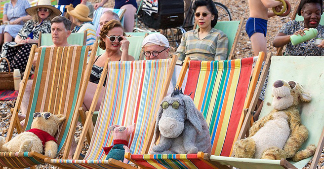 Just when you thought Disney's CHRISTOPHER ROBIN couldn't look anymore adorable than it did in the film's debut trailer, Entertainment Weekly has unveiled new images for the upcoming family film that are sure to put a smile on your face. In the first photo, we can see Pooh, Piglet, Eeyore, and Tigger lounging on lawn chairs on the beach. Each of them is sporting a pair of their own sunglasses, while looking like they're waiting for Rabbit to come back from a nearby concession stand with snacks. Meanwhile, the second image features Ewan McGregor's grown-up Christopher Robin, navigating a bustling city sidewalk, his childhood friend tucked safely into the crook of his arm.