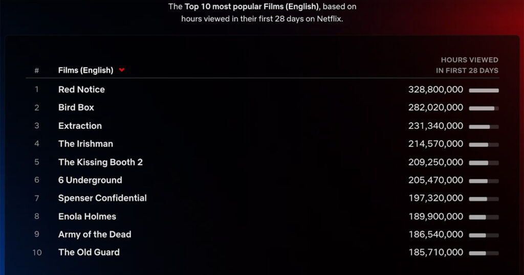 If you read my review of Red Notice (or watched the video above), you’ll know that I was not a fan of the much-hyped Dwayne Johnson/Ryan Reynolds and Gal Gadot team-up. While the production values were impressive considering it was shot during COVID, the movie itself was incredibly generic, with recycled action scenes and characters playing so close to type you wonder why any of them signed on in the first place (well, there’s the money I guess). Yet, it can’t be denied that the film has been a massive hit with viewers, with Netflix boasting about its performance for weeks now. While it previously ranked behind the Sandra Bullock vehicle Bird Box in terms of views, the latest stats from Netflix Top 10 show that Red Notice is now officially their biggest movie ever – with 328,800,000 hours viewed in twenty-eight days. Check out the top 10 below: