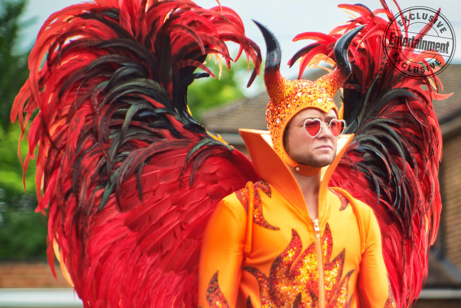 If you’ve seen the trailers for the movie you’ve already seen countless stupendous costumes Egerton wears as John and Day talks about how the costumes aren’t taken directly from John’s wardrobe but were instead created for the movie and inspired by the star’s looks over the years.