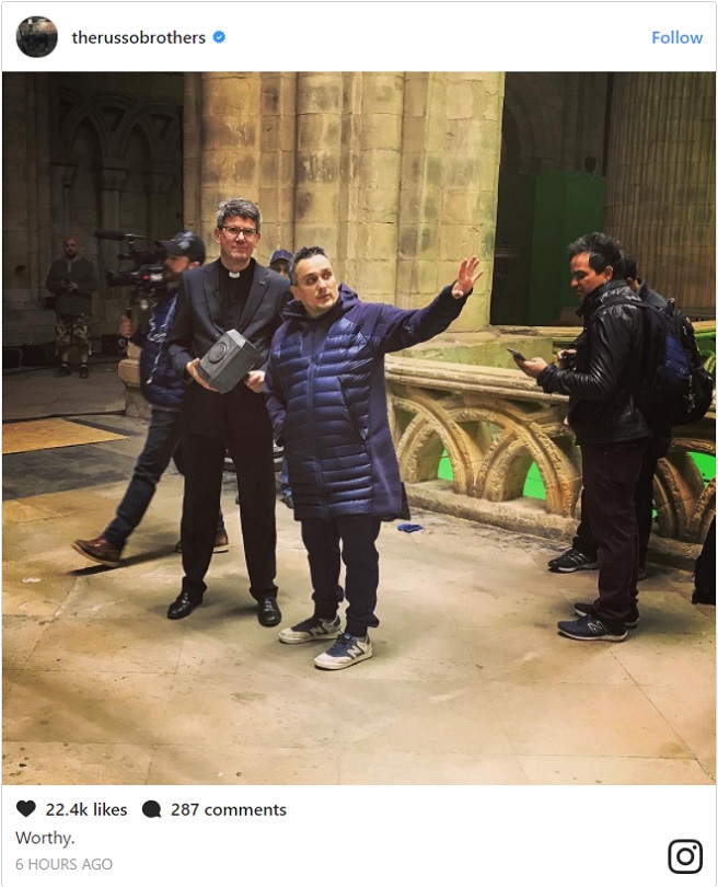 The above image was apparently taken on a location shoot at Durhan Cathedral in England, and shows director Joe Russo gesturing while a nearby priest holds the famous hammer. The photo was posted with a single-word caption attached: "Worthy."