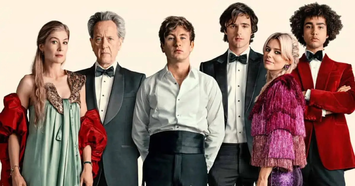 Set in 2006, Saltburn opens with the first day of classes at Oxford. We meet Oliver Quick (Barry Keoghan), a scholarship student who has none of the social inroads of his legacy classmates. Relegated to hanging out with fellow outsider Michael Gavey (House of the Dragon‘s Ewan Mitchell), Oliver makes nice with Felix Catton (Jacob Elordi) while making enemies with Felix’s cousin, Farleigh Start (Gran Turismo‘s Archie Madekwe). Felix, who is unfailingly nice to Oliver, invites his new friend to parties and eventually, after a tragic call from Oliver’s home, returns to his familial estate of Saltburn. It is at the titular home that Oliver meets Felix’s parents, Sir James Catton (Richard E. Grant), Lady Elsbeth (Rosamund Pike), and his sister Venetia (Alison Oliver). In no time, Oliver becomes entranced by the wealth and access that the Cattons possess, and it is only a matter of time before it transforms him and his ambitions.