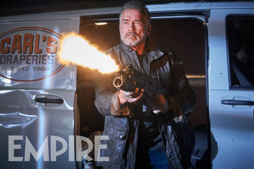 If you just watched the first trailer for TERMINATOR: DARK FATE then you know it was all about Mackenzie Davis, Linda Hamilton and Gabriel Luna hunting them down. There was only a brief amount of time dedicated to former Terminator Arnold Schwarzenegger, although he does manages to own the cool-as-ice stare. But for anyone hoping to see him back in action then a new image has dropped on the liquid metal heels of the new trailer, showing Arnold doing what he does best: Emerging out of a van and firing a gun large enough to kill a T-Rex.